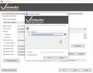 In the Assembly Schedules dialog, use the plus (+) icon to add an existing schedule such as “MEP Fabrication Pipe/Fitting Schedule.”