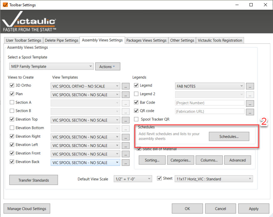 In the Toolbar Settings window, under the Assembly Views Settings tab, locate the Schedules section and click the Schedules button.